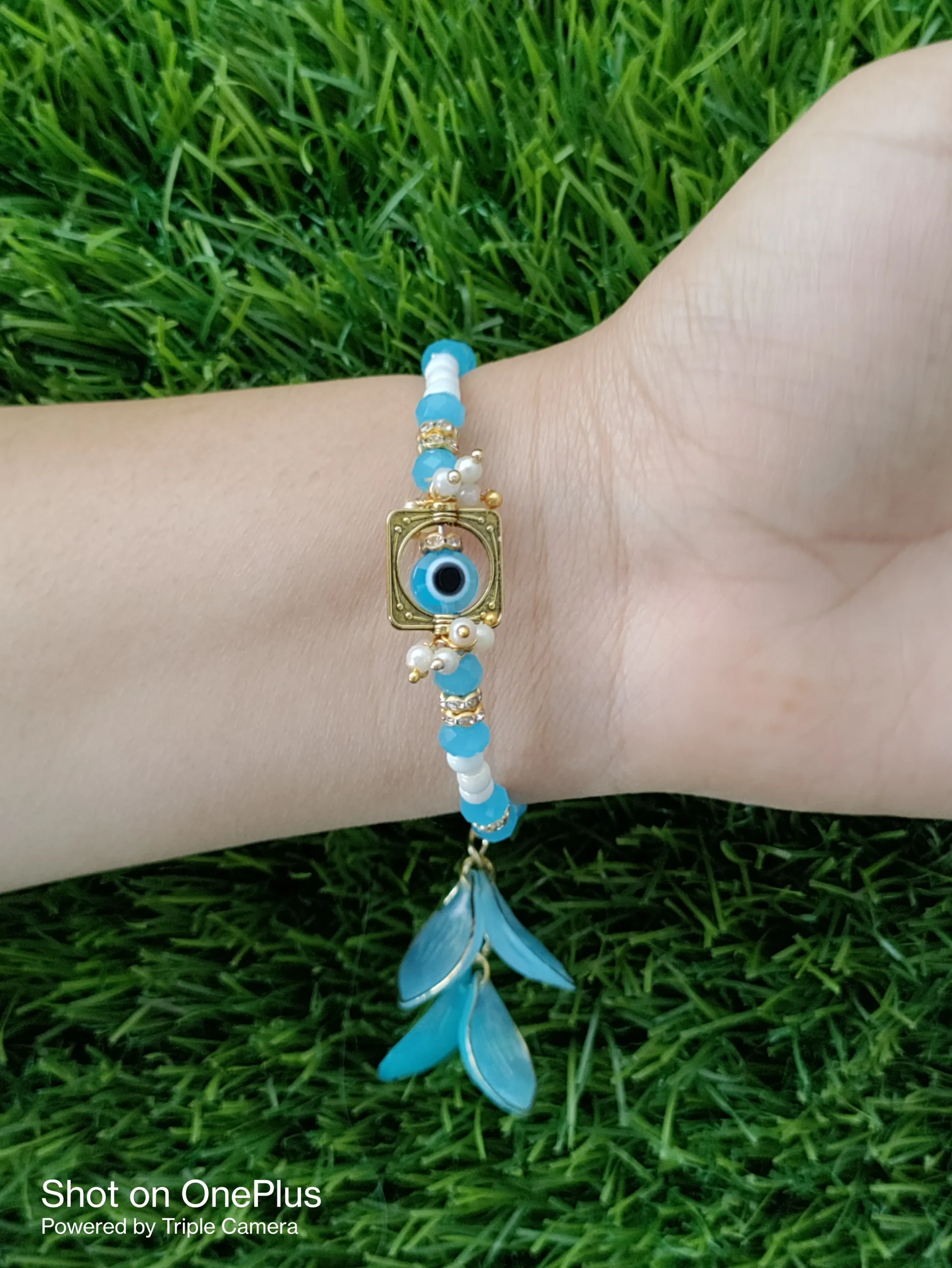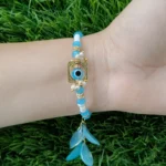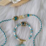 Celebrate your bond with a rakhi set that blends style, meaning, and protection. This elegant Bhaiya-Bhabhi set features a modern evil eye charm paired with soft blue beads and a chic bracelet design.